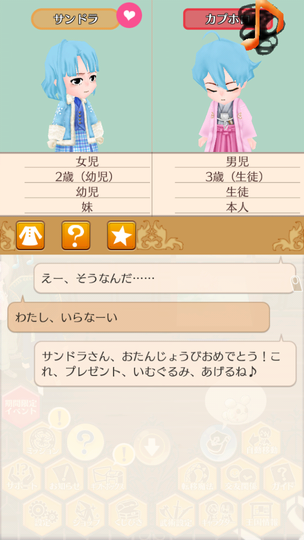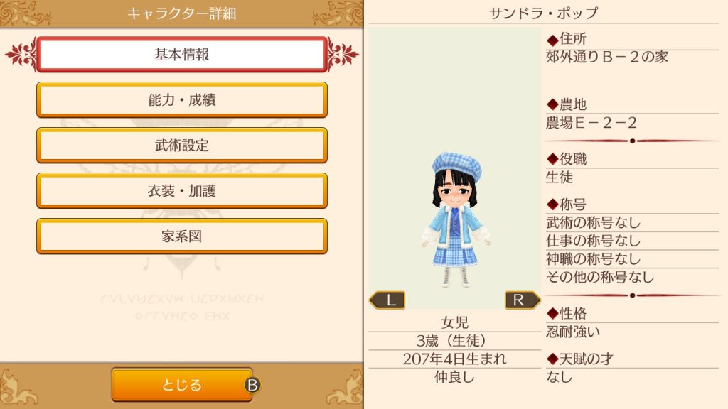 そういえば、サンドラちゃんという名前に既視感があって、数代前にいたような気がするなぁと思ってたのですが、実はSwitch版のジュスタンくんのデータに同名の子がいました。髪型も同じで心なしか雰囲気もちょっと似てますね。