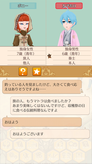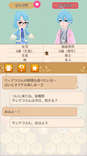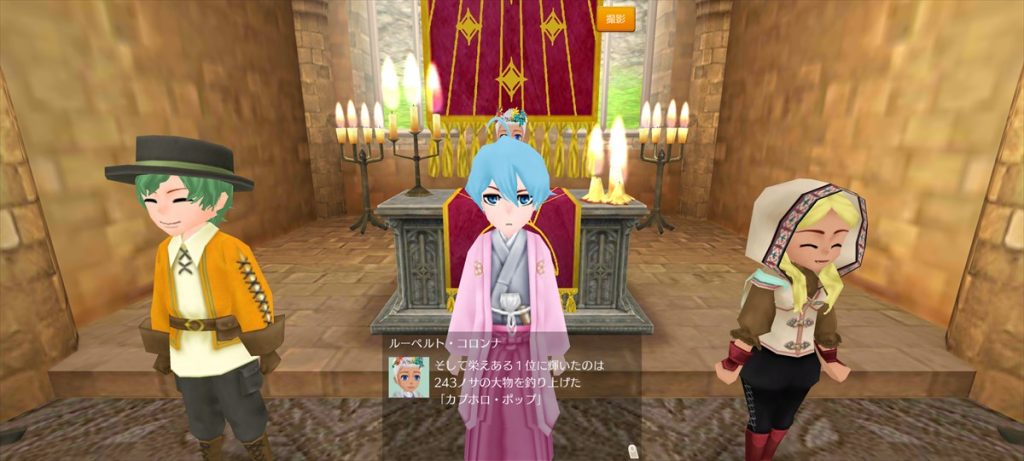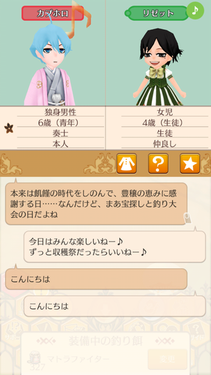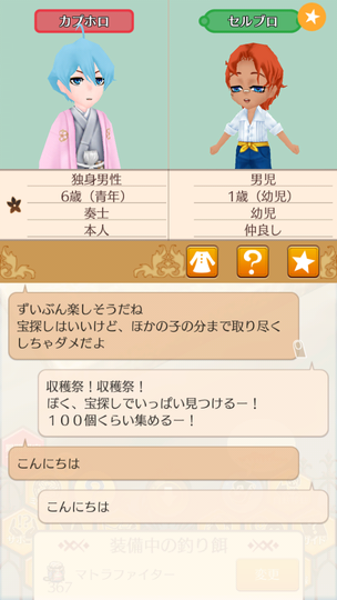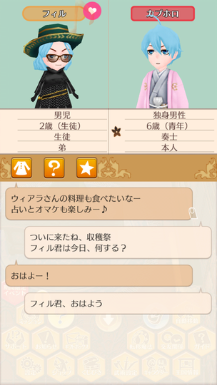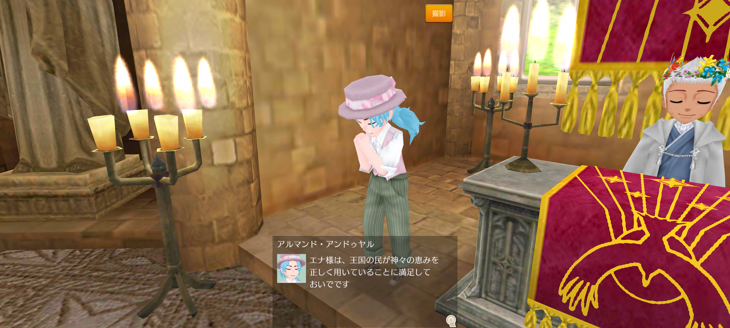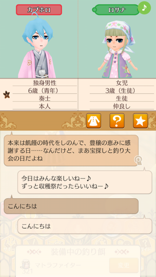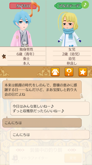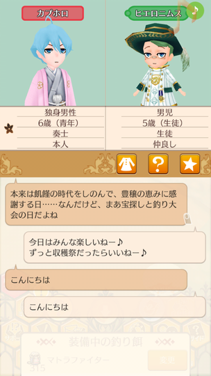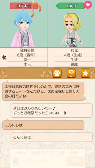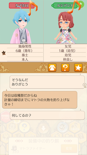 収穫祭の8日から。 今年も収穫祭がやってきた 今日も楽しそうな2人 今日の邸宅の主はフィルくん 実にえらそう。 豊穣の祈り 今年は新婚のアルマンドくんがエナの子としてお祈り。今更だけど、プルトのときはエナの子は恋人がいないことが条件だったのに、エルネアはなんで恋人ありでもOKになったんだろう? みんな楽しい収穫祭 旅人さんにマトラを勧めていく。 安定の釣り名人 別の旅人さんがランクインされてました。