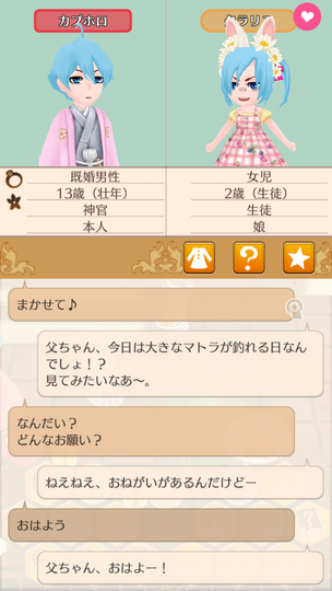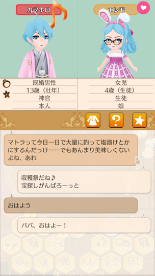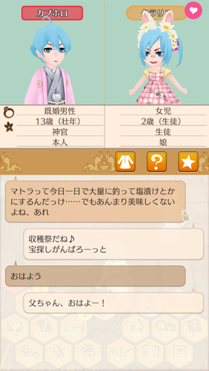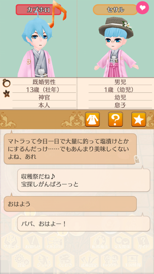 カプホロくんの天賦がフェルタ・エナ、コゼットちゃんの天賦がアカデ・アカデなのですが、どうやら子ども時代に親とマトラ定食食べに行くと、占いで出る結果はPCのものらしいということで、どちらかフェルタ引いてないかなーと2年待ったのですが、どうやらどちらもエナを引いた模様。クラリスちゃんがフェルタ引いてたらクラリスちゃんに引き継ぐつもりだったのですが。ということで、予定通りエレモちゃんに引き継ぐことに。ただ、いろいろ考えた結果、成人式に引き継ぐことにすることにしたので、カプホロくん代は来年まで続きます。