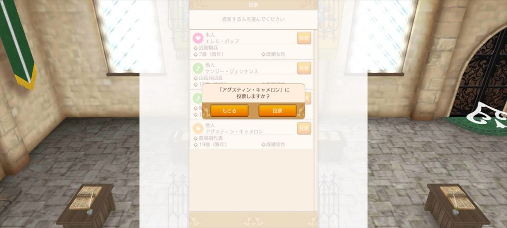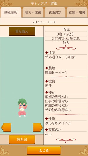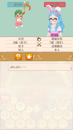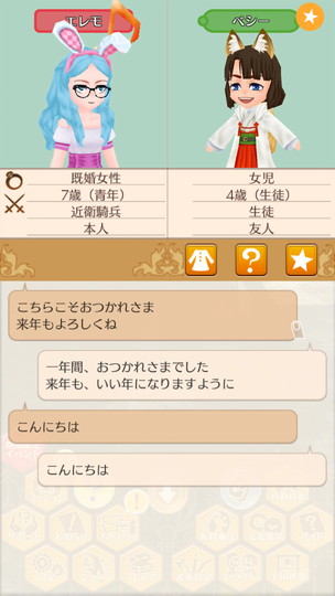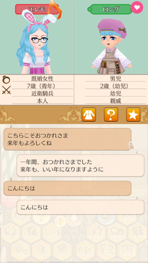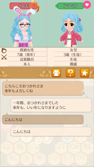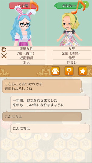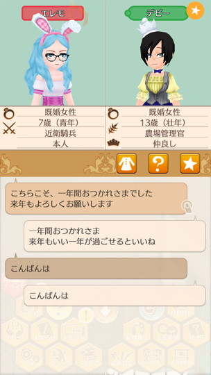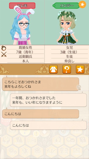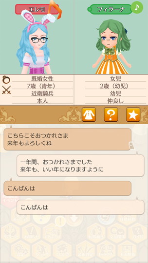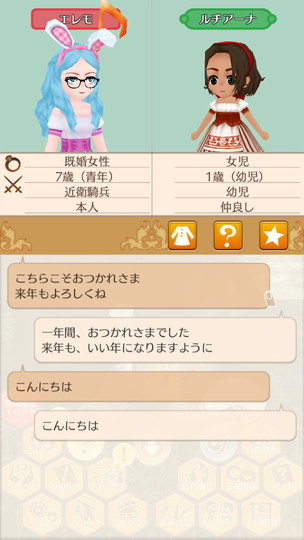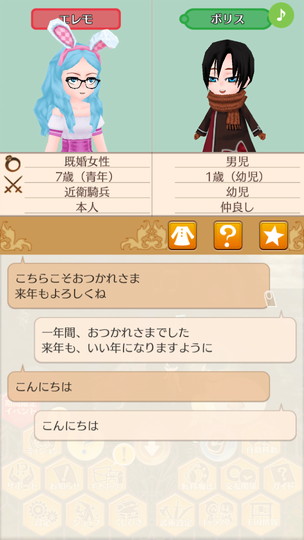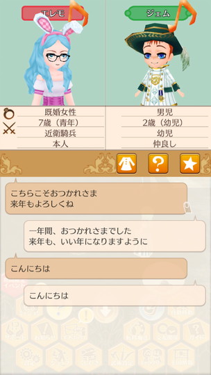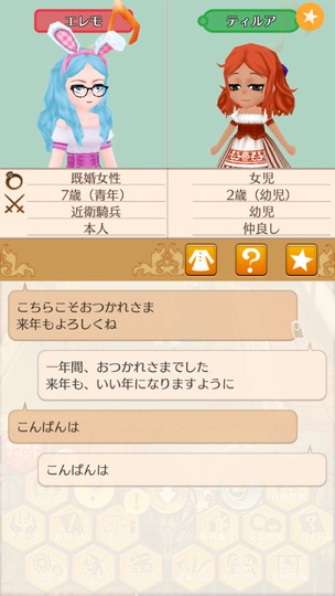 もうすぐ年末な29日から。 近衛騎士隊納剣式 来年は近衛騎士隊長として勤務します。 375年最後の朝食 今年も2人きりの年越し。来年は3人で年越しですね。 そのまま酒場で年越し会話 それにしても朝からサラダばかり食べてるディーンくん。ダイエット中? 評議会議長選挙 今年の候補者は全体的に若いですが、アグスティンくんの貫禄に一票。 マルセル王子の第2子誕生 ぷにぷにすき 第2子みんなのアイドルカレンちゃんです!お母さん寄りかな? みんなに年末のご挨拶