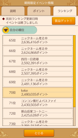 フェルタイベントお疲れ様でした。結局1週間近く更新サボってしまったわけですが、これまでのイベントの蓄積で、子どものたいけん服が9着ほどあったので、子ども時代のままでフェルタイベント過ごそうかと。年明けには成人ですし。一応成人とともに白夜の年を迎えるので、1時間フォモス有効に使いたかった思いもありましたが、成人1年目は農管になれないので体験服必要なのと、豊穣の鈴が180個くらいあったので、今回は鈴いっぱい使おうと。子ども時代にフェルタイベント重なることも少ないですしね。ということで結果発表。