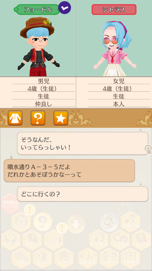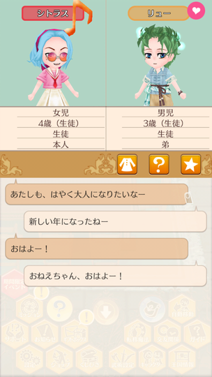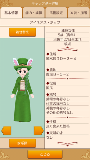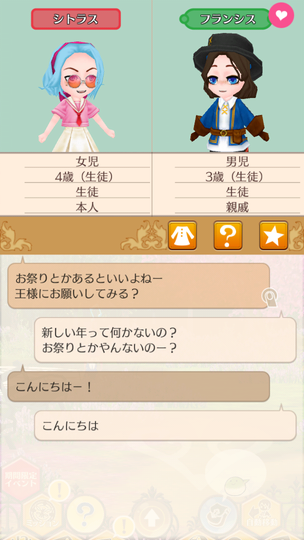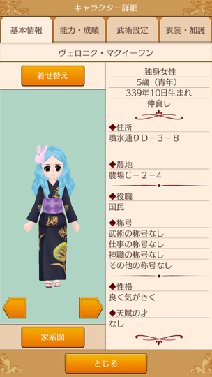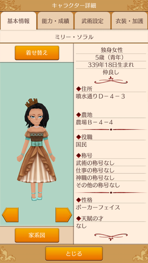 ヴェロニクちゃんはイゴールくんとお揃いの浴衣に。イゴールくんが1年待ってくれたので早く結ばれてほしいところ。アイネアスちゃんは帽子に合わせてもう少しハロウィン感か、メルヘン感ある衣装がよかったけど、手持ちになかったのであまり使っていなかった衣装で。現代マルコスさんの子で懐かしの国王の名前のミリーちゃんは王様風に。