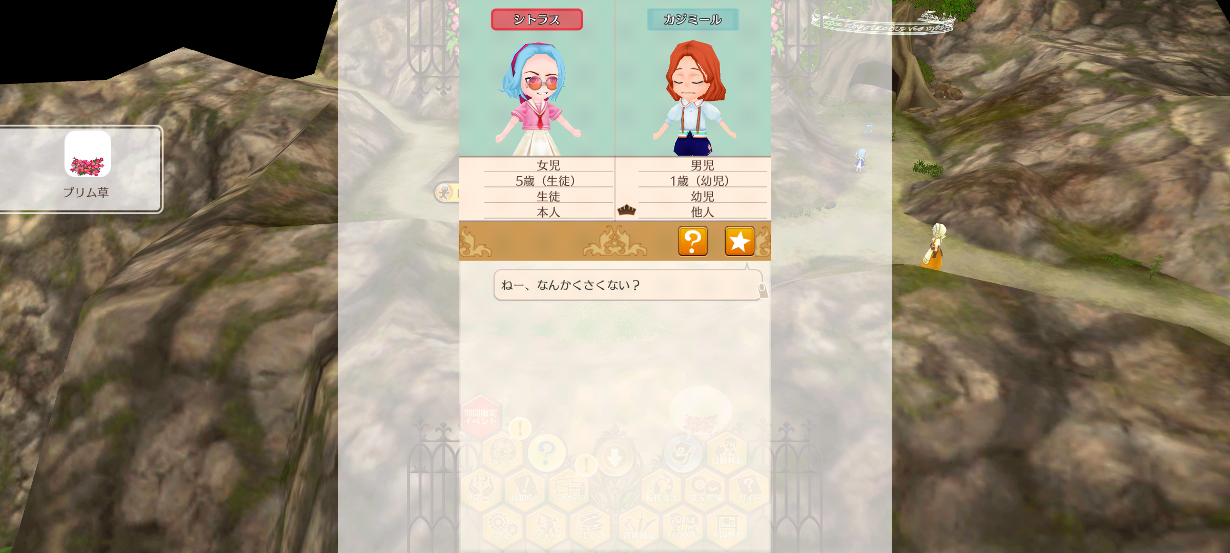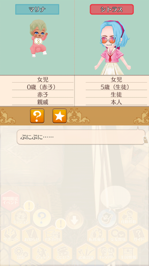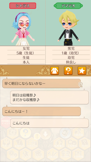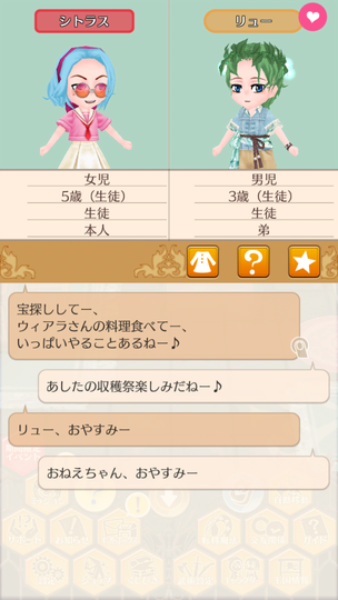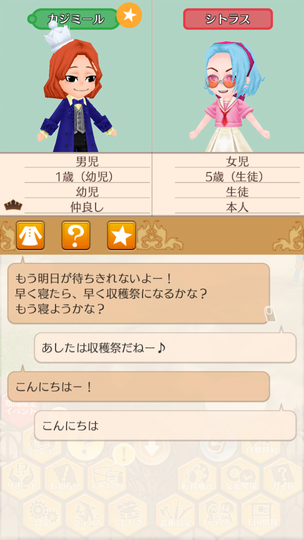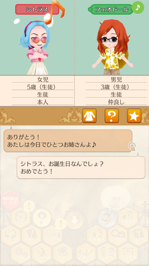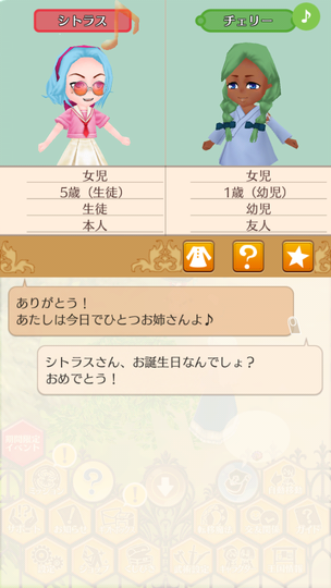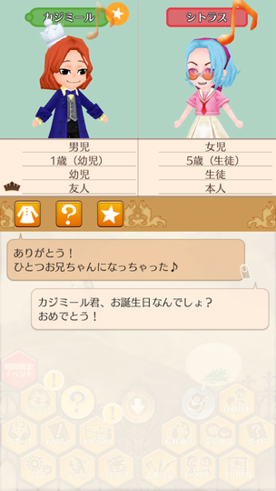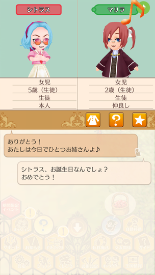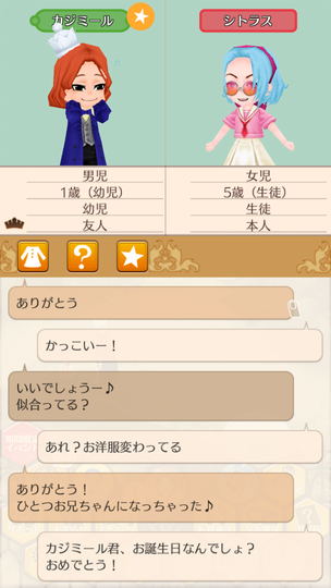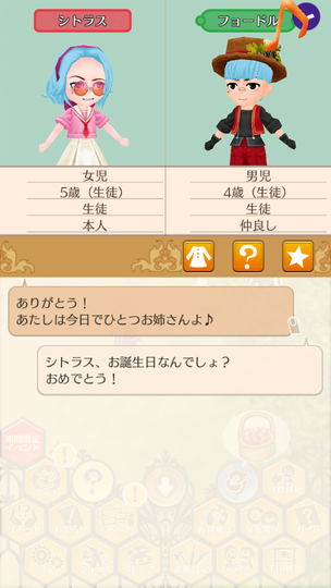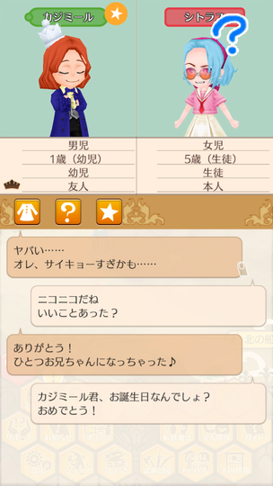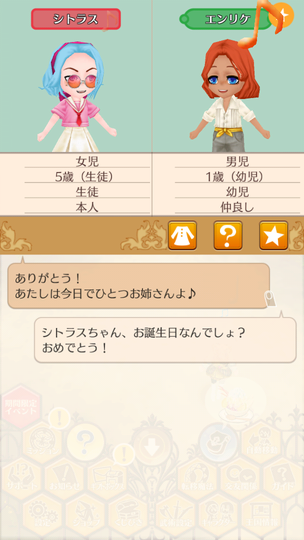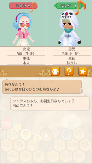 シトラスちゃんの誕生日の3日から。 シトラスちゃん5歳の誕生日 みんなからの誕生日おめでとう みんなとラダくさわやか~ 起きてきた殿下の第一声 未来の国王カジミール殿下が起きてきましたが、第一声がコレ。またまた困り眉殿下です。 殿下と仲良しに イヴァーノ・アルファ夫婦の第二子誕生 ぷにぷにすき 髪色と遺伝系統見る限りイヴァーノくん寄りかな? ライムママの龍騎士期間が終わったのでいつもの衣装に 正月に戻すつもりだったの忘れてました。 いよいよ明日は収穫祭
