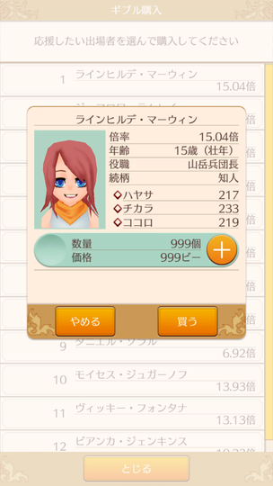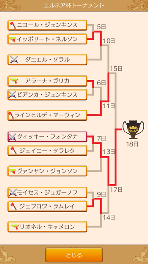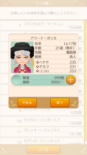 パラメータ的にはトップのこの2人が勝つかなと思い、相性とパラメータ差で甲乙付け難く両方買ったのですが、結果は近衛騎士隊のヴィッキーさん。パラメータは平均210程度と、近年の近衛騎士隊らしく他組織の出場者に対して大きく劣るのですが、勝因は、エルネア杯中に対戦相手となる予定だったヴァンサンさんが亡くなったことで、相性の良い相手ばかりが当たったという。この展開は予想できませんでしたね。