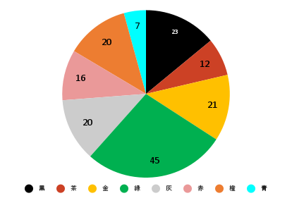 圧倒的緑。こちらも他の髪色の倍。かつてチョリシーズくんとの結婚を避ける予定だったのはこのせい。茶色と黒は見分けがつきづらかったのでもう少し茶色が多いかも。そして圧倒的に少ない青。15代目のときは2人なのでシトラスちゃん、ヘレンちゃんで多少盛り返しました。実際はまだ生まれていなかった子もいたのでもう少し後で増えましたが。相変わらず青は少ないので、しばらくはポップ家は青だらけになる予定です。かつては橙も青に次いで少なかったのですが、末裔ちゃんと王家を中心に大幅に増えました。