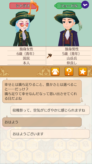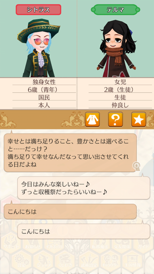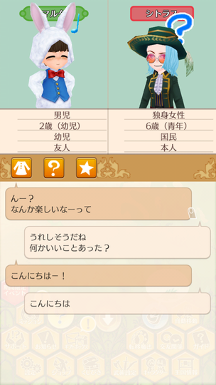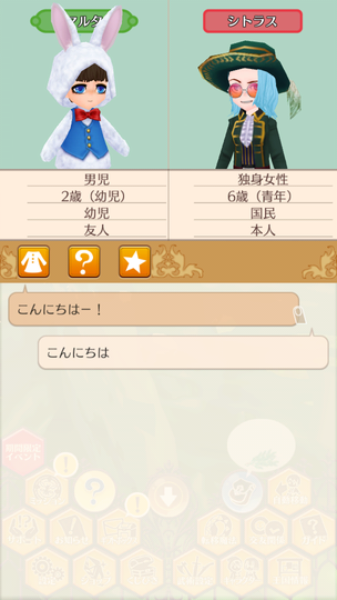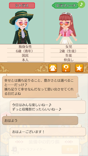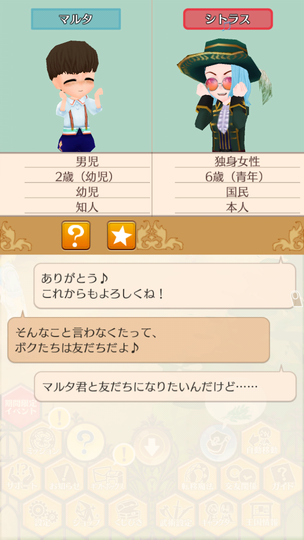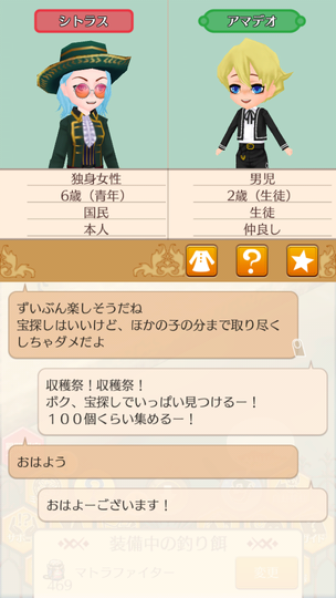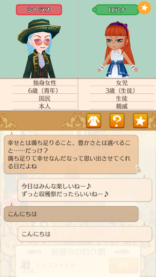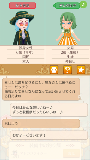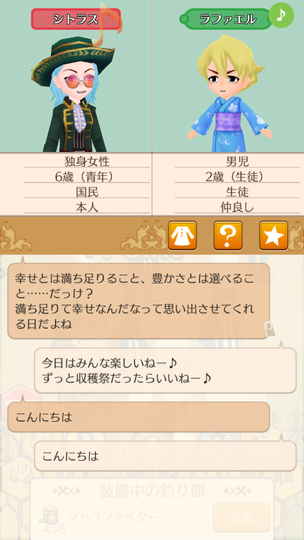 シトラスちゃんが大人として参加する初の収穫祭。 マトラはおいしくない いま食べてるラゴ串の方がおいしい。 青髪カップルによる豊穣の祈り 無事結ばれててよかったよかった。 収穫祭を楽しむ子どもたち 収穫祭を楽しむ大人たち ヘレンちゃんと宝探し ダニエラちゃんの弟マルタくん 仲人忙しくて2歳になるまで友人になれていなかった、ダニエラちゃんの弟マルタくん。ようやく友人に。 釣り大会は余裕の1位