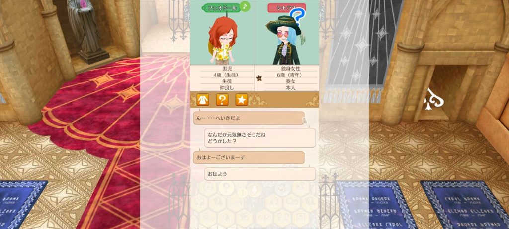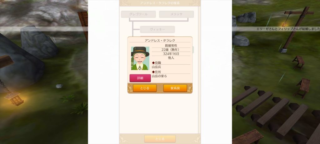 これは!と思って坑道から追いかけましたが、無事結ばれました。お相手のカルロスくんは末裔ちゃんで、糸目ジュリアーナさんの甥っ子。