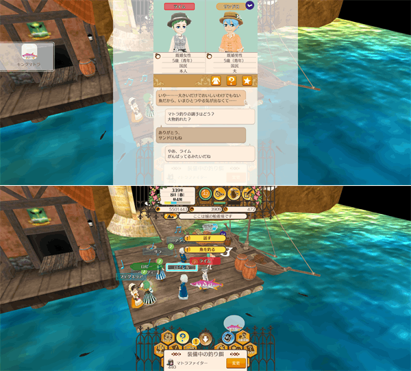 忘れそうになりますが、今日は収穫祭。結婚式後はマトラ釣りに興じる ライム ちゃん。ちょうどキングマトラが釣れたタイミングで話しかけてくるサンドロくん。