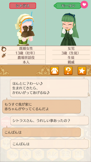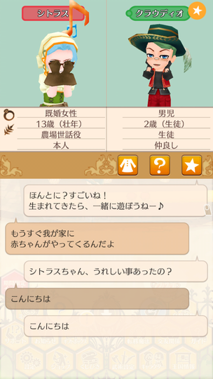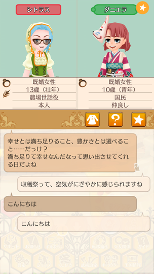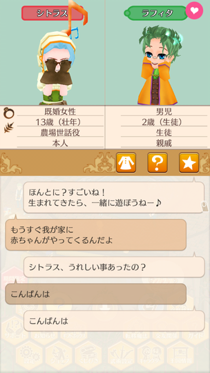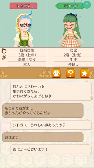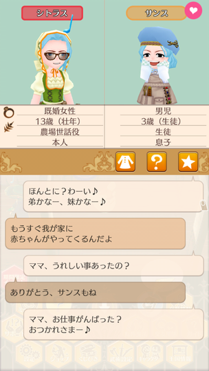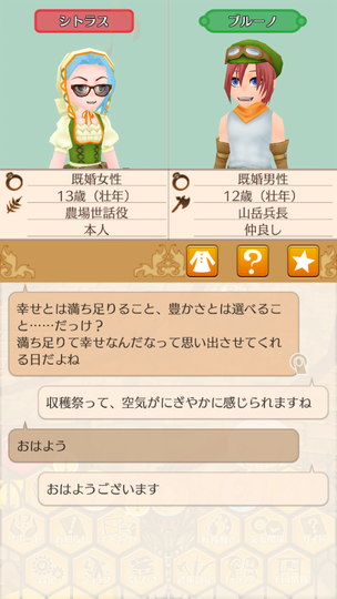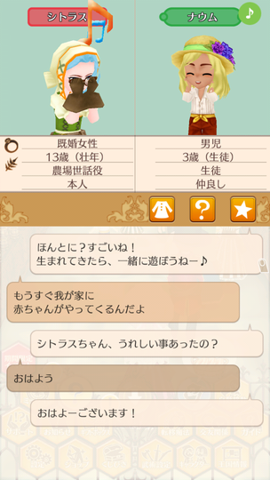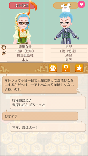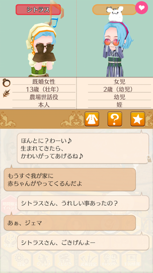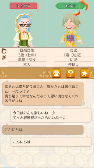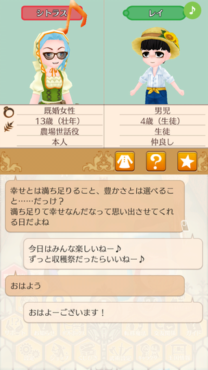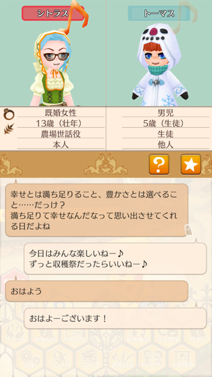収穫祭の8日から。 今年も収穫祭がやってきた 豊穣の祈り 収穫祭を楽しむみんな 結婚記念日に帰らずの洞窟? いえ、酒場でお祝いです シトラスちゃんはこんなこと言ってますが、1,000個近い手作りドーナッツ外で売ってるのはシトラスちゃんなので重みがありますね。 たのしいきぶんで、たべればおいしい 今年はイクスくんとマトラを食べに。 今年は普通に釣り名人 追加で神殿結婚記念日デート 専用会話ほしいですね。 妊娠したのでまたみんなからお祝い