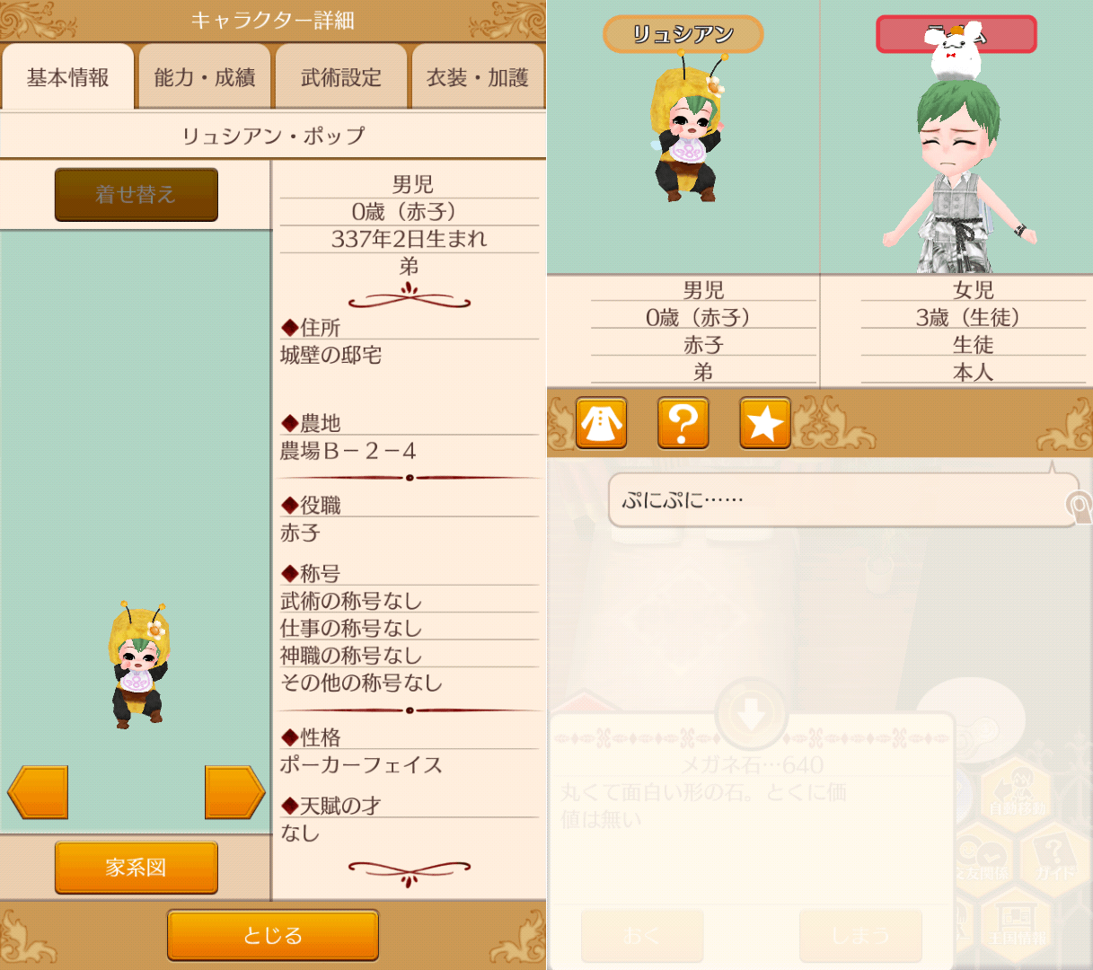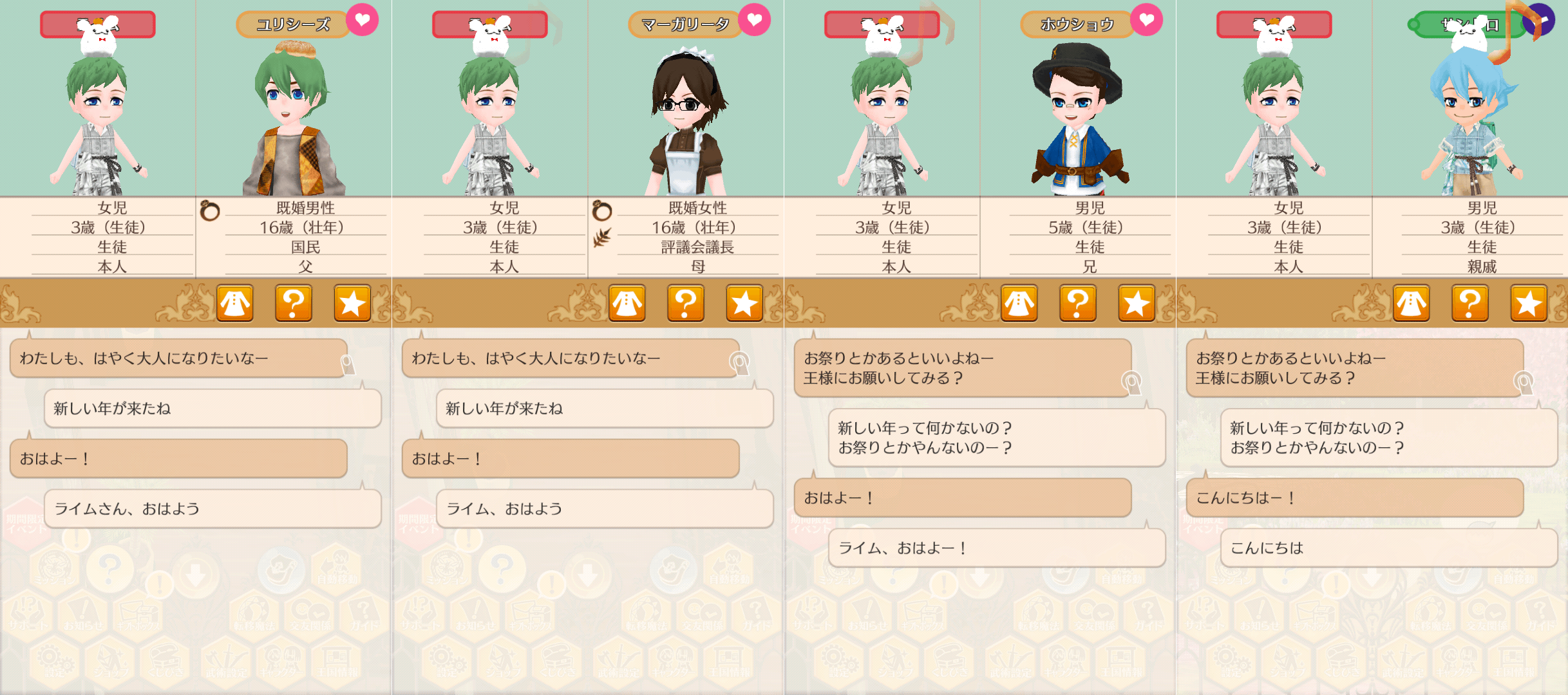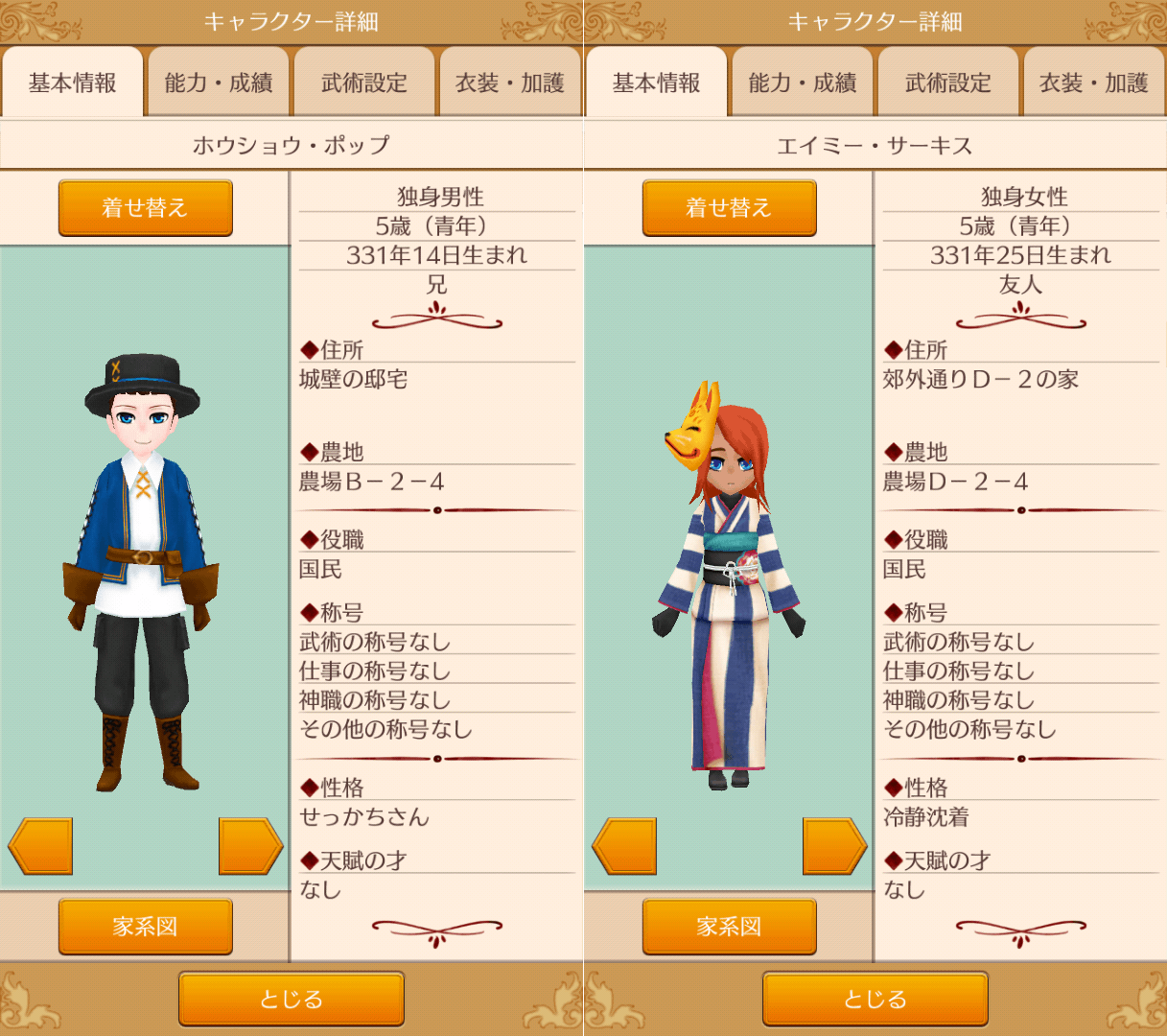 ホウショウくんは引き続き紺の伝統衣装に。お見合いは特にさせてないですが、仲の良いイフィゲニアちゃんが成人する1年後まで待ってくれるかどうか。エイミーちゃんは姉のアビーちゃんと同じく着物とお面のセットで。