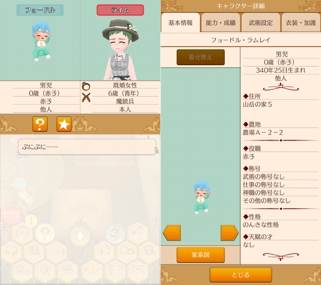 山岳で青髪のフョードルくんが誕生しました。第二子なので、山岳入りしなくて良いですし、シトラスちゃんと同い年なので、配偶者候補です!そして、2歳上のイゴールくんは、1歳上のヴェロニクちゃんと青髪カップル、そして将来のシトラスちゃんの子の配偶者候補に…とそこまで上手くいくかはわからないですが、そんな感じで今後進めていこうかと思います。