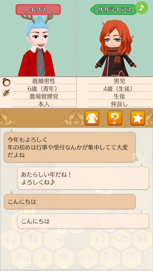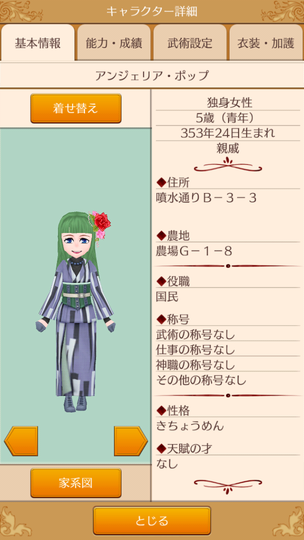 ビセンテ殿下は成人、同い年のエミリーちゃんとの仲人してたので、エミリーちゃんは王族風緑な服に。アンジェリアちゃんはご先祖様の煽り眉スダチを思い出しますが、煽り眉ではないです。末裔ちゃんのマルタくんの子グランヴィルくんも成人。
